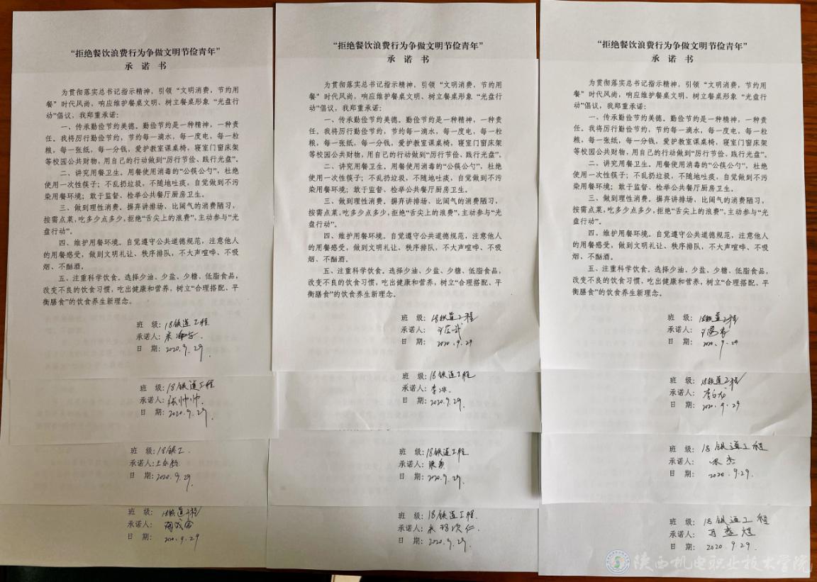 与此同时,各团支部各班还召开了“光盘行动”主题班会。班会上,班主任组织学生开展节约与浪费大讨论。同学们或引经据典、或联系生活,阐释了每个人都必须节约粮食的道理,并签署承诺书。