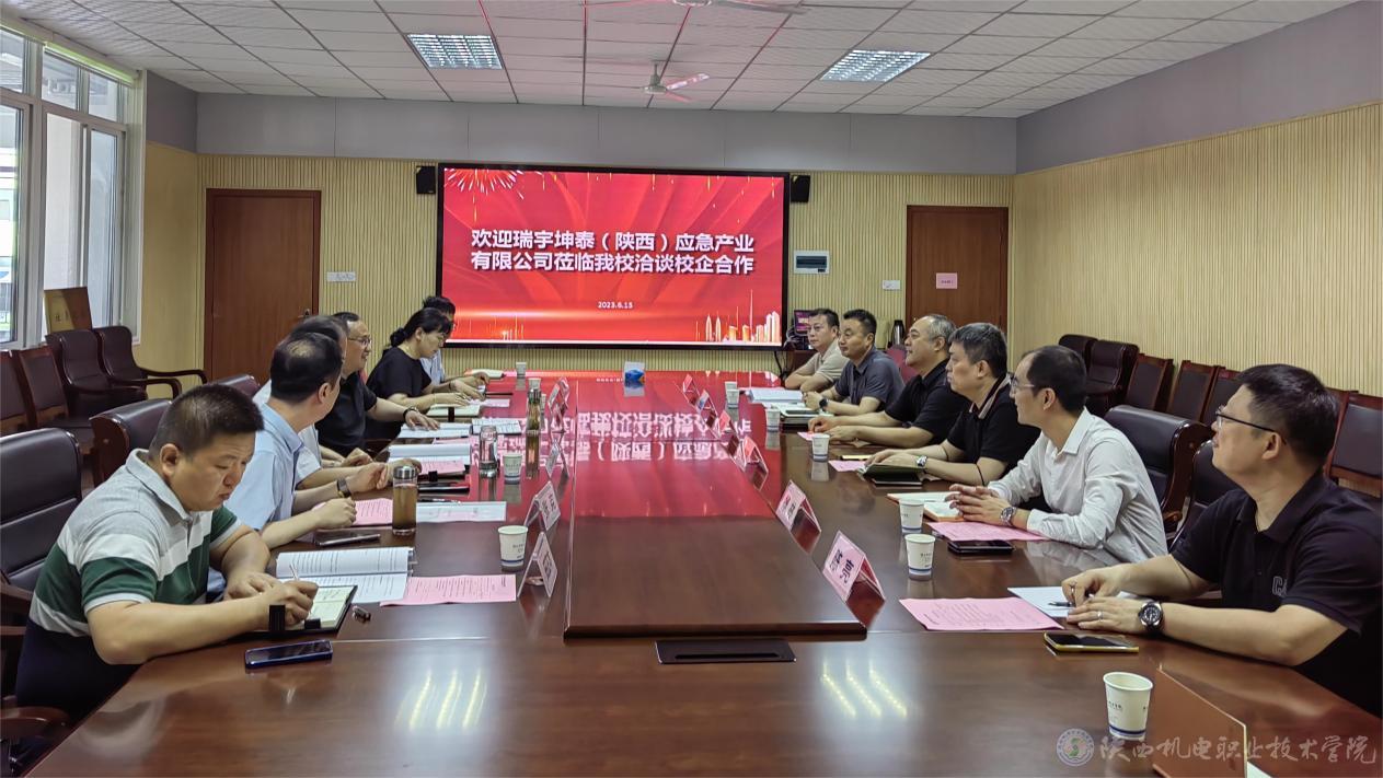 为推动产学研协同创新,寻求校企合作共赢、共谋发展的良好局面,深化产教融合发展,促进高素质应用型人才培养。2023年6月15日,瑞宇坤泰(陕西)应急产业有限公司董事长周浩一行7人莅临我校洽谈校企合作事宜。党委书记伊逊智,党委副书记、院长向纪明,党委副书记、纪委书记陈红梅,党委委员、副院长张克等接待了周浩一行,并举行会议。会议由副院长张克主持。
